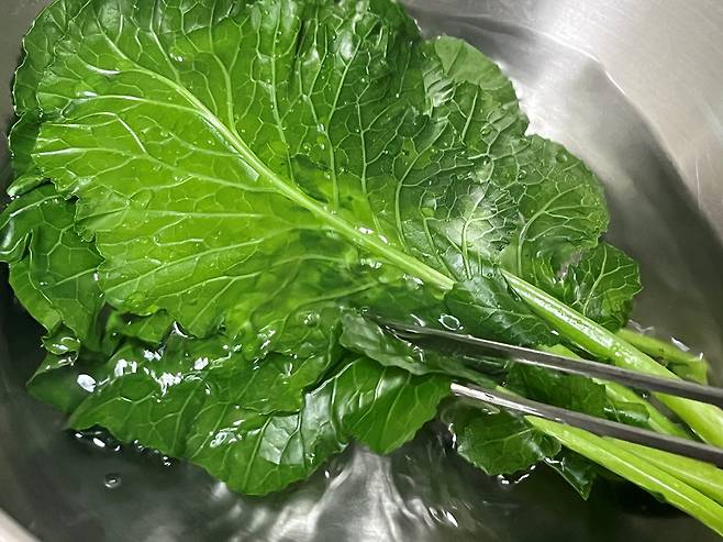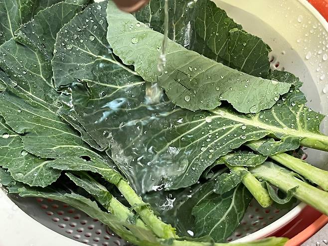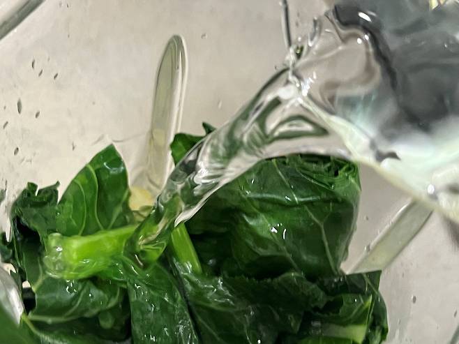 케일은 생으로 갈기보다는 살짝 데쳐서 갈아 마시면 소화가 잘되고 쌉싸름한 맛을 없앨 수 있습니다. 뜨거운 물을 케일에 부은 후 약 20초 담가둡니다.