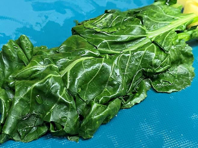 케일은 물기를 짜고 4등분을 해서 준비합니다. 특히 생야채를 먹으면 소화가 잘 안 되거나 탈 나는 분들은 꼭 데쳐서 사용하세요.