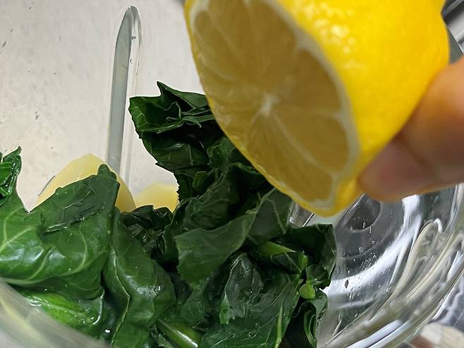 재료를 믹서에 넣고 레몬 1/2개를 준비하여 즙을 짭니다. 레몬 반 개만 넣어도 꽤 상큼한 맛이 됩니다. 신 맛을 선호하지 않으시면 레몬 1/4개만 쓰세요.