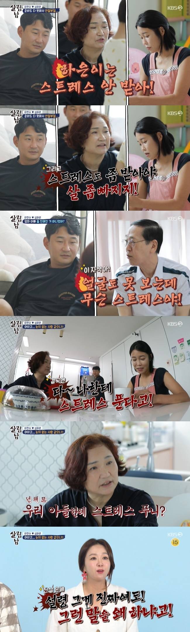 이천수가 “괜히 주방 가서 애 스트레스 주지 마라”고 말하자, 이천수 엄마는 “하은이는 스트레스 안 받는다. 그리고 스트레스 받아야 살 좀 빠지지. 나는 아버님 때문에 스트레스 받아서 살이 쫙쫙 빠진다”라고 남편의 흉을 봤다.