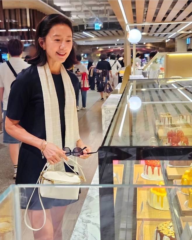 배우 김희애가 16일 인스타그램에 "화이트 애정템🤍 두르고 맛나보이는 케이크 구경중🍰"이라는 글과 함께 여러 장의 사진을 게재했습니다.