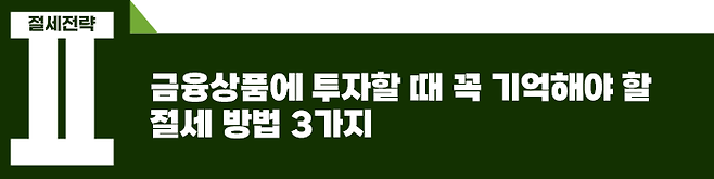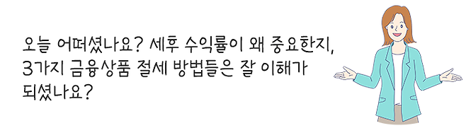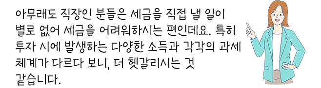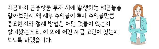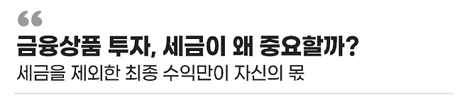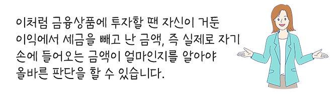 그러므로 자신이 투자할 금융상품에 세금이 얼마나 붙는지 정확히 알아야 현명한 의사 결정이 가능합니다.