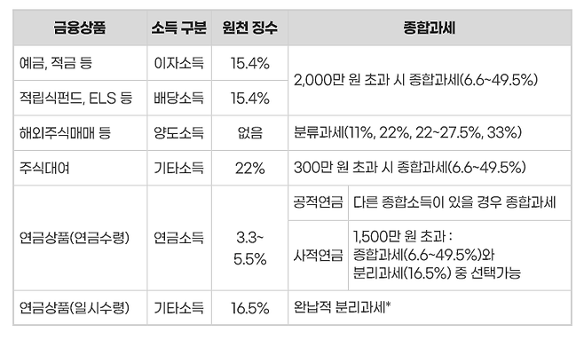 이자소득은 보통 예∙적금 등의 이자, 배당소득은 적립식 펀드∙ELS 등의 금융상품 투자 시에 발생하며, 일반적으로 2개의 소득은 15.4%(지방소득세 포함)의 세율로 원천징수됩니다.