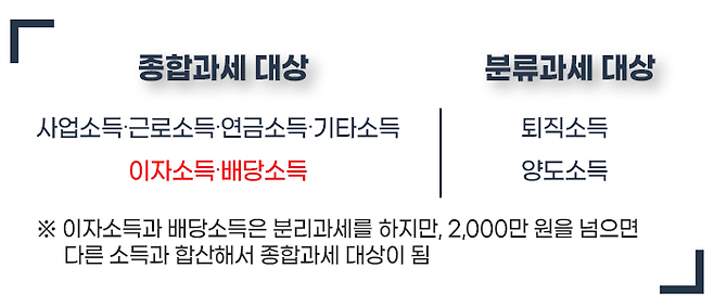 게다가 비과세, 분리과세 상품에서 발생한 금융소득은 종합과세 여부를 판단하는 기준금액인 2,000만 원에 포함되지 않습니다.