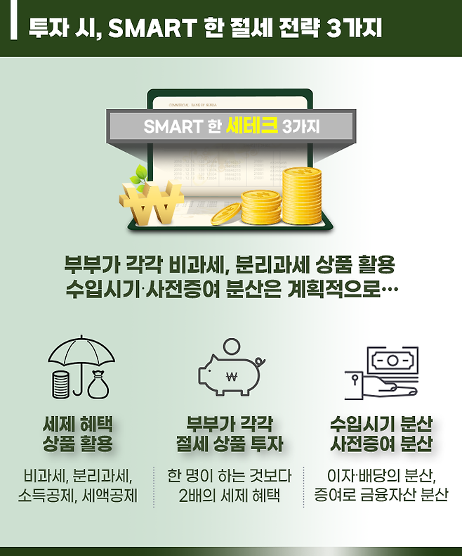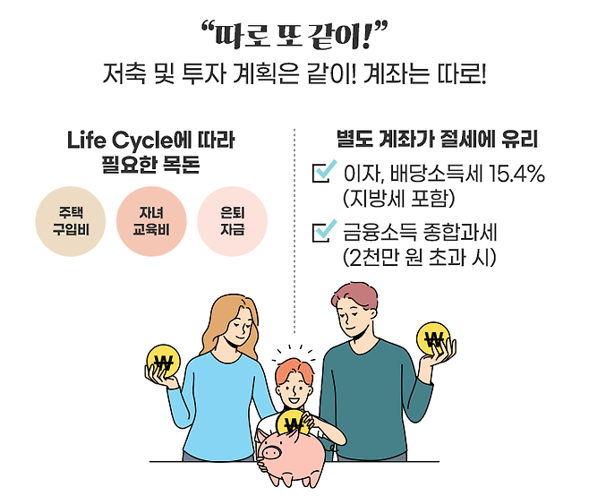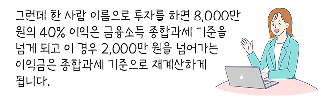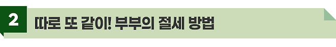 그래서 부부가 자산을 지속적으로 키우고 관리하기 위해서는 저축과 투자가 병행되어야 하지만, 이 경우에는 저축 및 투자의 계획은 같이하되, 계좌를 별도로 관리하는 것이 절세 측면에서 합리적입니다.