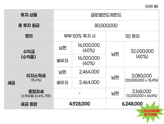 부부가 각각 4,000만 원씩 투자하였다면 1,600만 원이 이익이므로 금융소득 종합과세 기준을 넘지 않고, 각각 15.4% 과세로 종결되고, 세금은 총 492만 8천 원입니다.