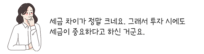 여기에 꼭 놓치지 말아야 할 한 가지가 더 있는데, 바로 세금입니다. 아무리 수익이 많이 난다고 해도 실제로 세금을 얼마나 떼느냐에 따라 손에 쥘 수 있는 이익금이 달라지기 때문인데요.