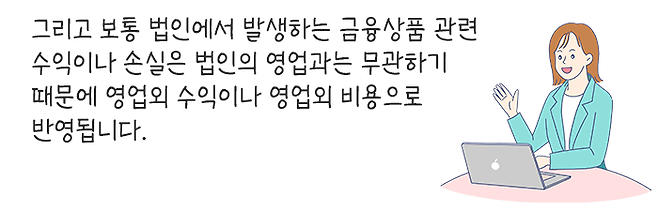 보통 법인에서 발생하는 금융상품 관련 수익이나 손실은 법인의 영업과는 무관하기 때문에 영업외 수익이나 영업외 비용으로 반영됩니다.