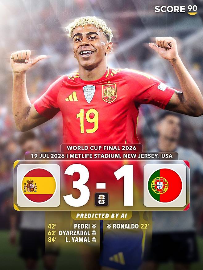 이어 후반 17분 미켈 오야르사발이 역전 골을 터뜨리고 후반 39분 라민 야말의 쐐기 골이 터지며 스페인이 월드컵을 들어 올린다는 시나리오다.