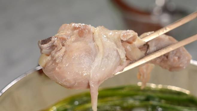 - 쪽파 올리고 익을 정도로 끓이면 완성, 쪽파에 닭고기를 싸 먹으면 더 맛있다.
