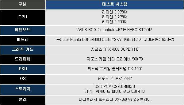 라이젠 9 9000 시리즈의 테스트는 지난 번과 동일하게 ASUS ROG Crosshair X670E HERO STCOM 메인보드와 V-Color Manta DDR5 6000MHz CL36 XSKY RGB 패키지(16GB*2), 지포스 RTX 4080 SUPER FE 기반 시스템에서 진행하였다. CPU에 번들 쿨러가 없는 관계로, 모든 CPU 테스트에는 120mm 3열 일체형 수랭 쿨러인 다크플래시 트위스터 DX-360 ver2.6를 장착, 팬 속도와 펌프 속도는 최고 속도로 고정한 상태로 사용하였다.