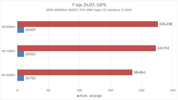 이는 긱벤치와 7-zip 테스트에서도 비슷하게 나타나는데, 특히 긱벤치 6.3.0 멀티 스레드 테스트에서 라이젠 9 7950X의 성능이 라이젠 9 9900X보다 낮게 나온 것이 눈길을 끈다. 이들 테스트의 싱글 스레드 결과는 라이젠 9 7950X가 가장 낮게 나와, Zen5의 개선된 IPC가 눈에 띈다.