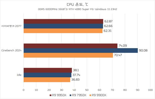 라이젠 9 7950X와 비교해 라이젠 9 9950X의 전력과 온도도 큰 폭으로 개선된 것을 볼 수 있다. 특히 시네벤치 2024 멀티 스레드 테스트 기준 온도가 약 16℃ 가량 낮아져, 요즘같이 더운 여름철에 보다 쾌적한 작업 환경을 기대할 수 있다.