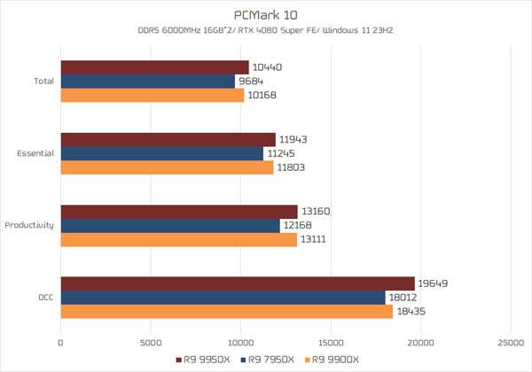 이는 비교적 멀티 스레드 성능 활용도가 낮은, 일상적인 PC 사용 환경을 테스트하는 PCMark 10 결과에서도 나타나는데, 전체적으로 라이젠 9 9950X가 가장 높은 성능을, 다음은 라이젠 9 9900X가, 마지막으로 라이젠 9 7950X가 나타났다.