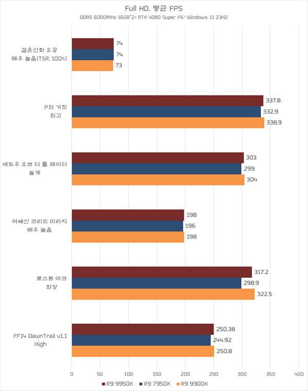 한편, 라이젠 9 9950X의 게임 성능은, 그래픽 카드 영향도 있겠지만, 메인스트림 모델들에 비해 향상폭이 두드러지지 않아, 게임 플레이 비중이 크다면 향후 출시될 X3D 모델을 기다려 보는 것이 좋겠다.