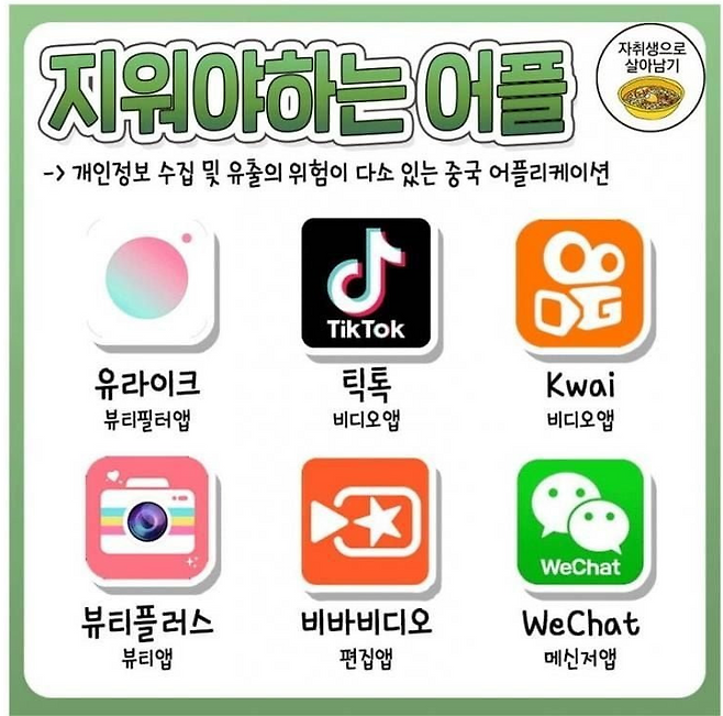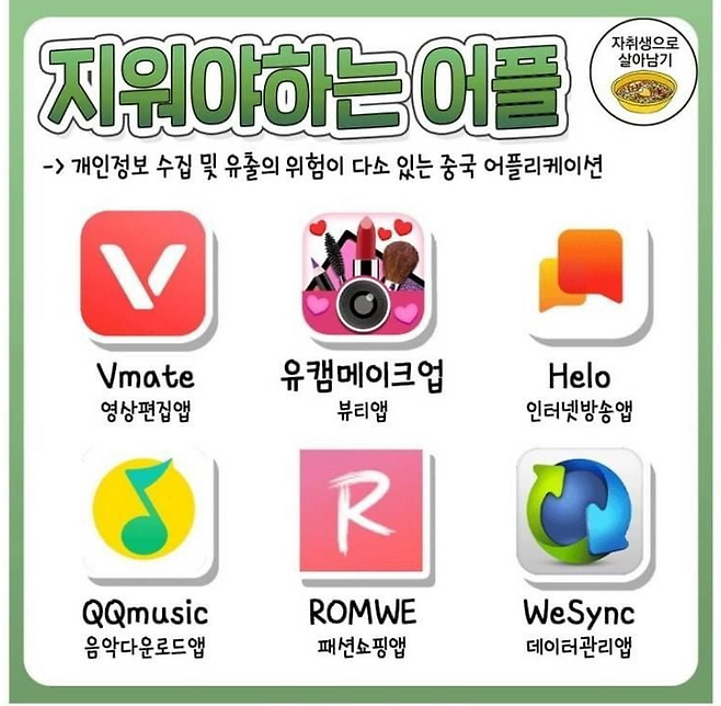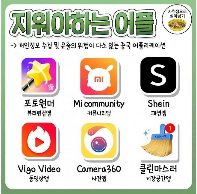 아래는 반드시 삭제하거나 사용 여부를 재검토해야 할 앱 유형 및 구체적인 앱 예시입니다.