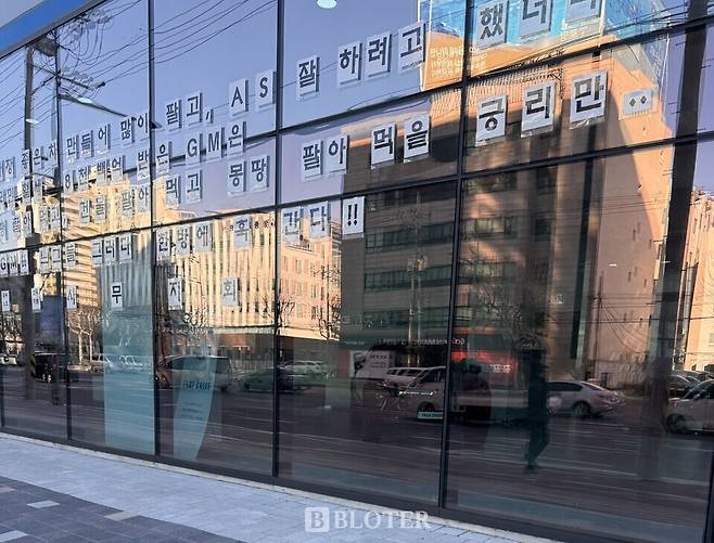 6일 현재 서울서비스센터 외벽에는 ‘서울서비스센터 전시장 그랜드 오픈’이라는 문구와 함께 GM을 규탄하는 금속노조 한국지엠사무지회 팻말이 부착돼 있다. GM 한국사업장 내 노사 갈등 상황이 그대로 드러나는 대목이다.