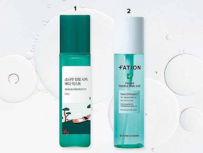 1 라운드랩 소나무 진정 시카 보디 미스트 소나무 추출물에 시카를 배합한 소나무 시카 액티버™가 외부 자극에 민감해진 피부를 빠르게 잠재운다. 히알루론산과 베타인이 약해진 피부 장벽을 튼튼하게 가꿔준다. 150ml 2만3000원.