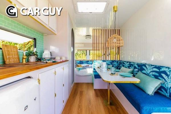좌석과 식사 공간, 충분한 수납공간, 목재 벤치, 얇은 커튼, 스테인리스 스틸 소재가 적용된 싱크대, 공간 절약에 도움을 주는 접이식 침대 등 다양한 레이아웃은 구매자의 필요에 따라 설계된다.