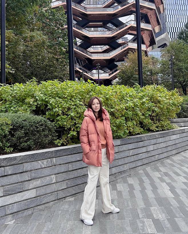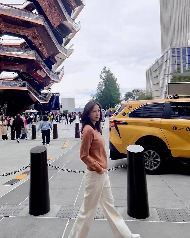 손태영이 뉴욕의 랜드마크를 배경으로 화사한 겨울 패션을 선보이며 근황을 전했어요.