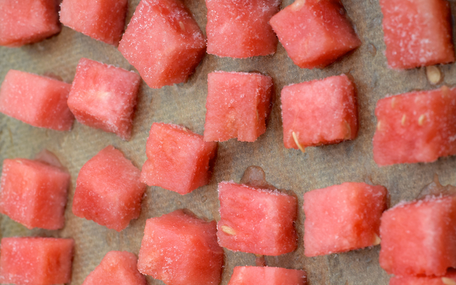 수박은 잘라 두는 순간 표면 당도가 급상승해 대장균·살모넬라가 번식하기 쉽습니다. 얼렸다가 해동되는 과정에서 세균이 폭발적으로 늘어나는 데다 과당이 장내 삼투압을 치솟게 해 수분이 장으로 급히 끌려 들어가 물 같은 설사를 유발하고 장 점막 염증을 치명적으로 악화시킵니다.