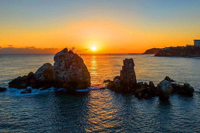 애국가 첫 소절의 배경 화면으로 등장하는 곳으로, 해오름의 본고장인 동해의 일출 스폿입니다.