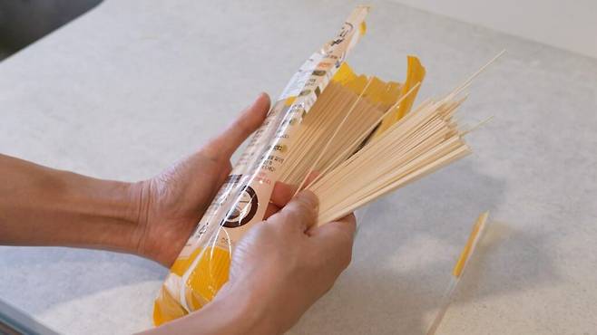 국수 봉지 자를 때 윗부분을 잘라서 사용하시나요? 국수 특성상 길이가 길기 때문에 윗부분을 자르면 불편한 부분이 많은데요. 특히 국수를 빼거나 다시 밀봉할 때 정말 불편한 것 같아요.