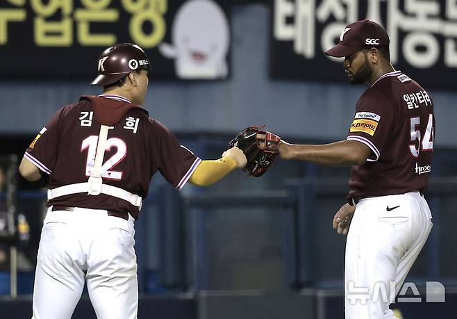 [서울=뉴시스] 정병혁 기자 = 16일 서울 송파구 잠실야구장에서 열린 2025 KBO리그 키움 히어로즈 대 두산 베어스의 경기, 7회말을 막아낸 키움 선발 알칸타라가 포수 김건희와 주먹을 맞대고 있다. 2025.09.16. jhope@newsis.com