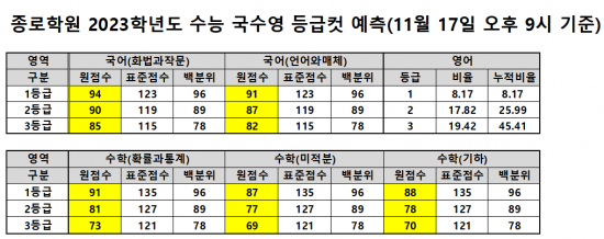 입시업계가 발표한 1등급 커트라인도 국어는 지난해보다 7~8점 올랐고 수학은 지난해와 비슷한 수준이다. 종로학원이 발표한 원점수 기준 1등급 컷은 ▲국어(화법과작문) 94점 ▲국어(언어와매체) 91점이며 지난해보다 8점, 10점 상승했다. 수학은 ▲확률과통계 91점 ▲미적분 87점 ▲기하 88점으로 작년보다 각각 1점씩 올랐다. 영어 1등급 비율은 8.17%로 예상되며 지난해(6.25%)보다 늘어날 전망이다.