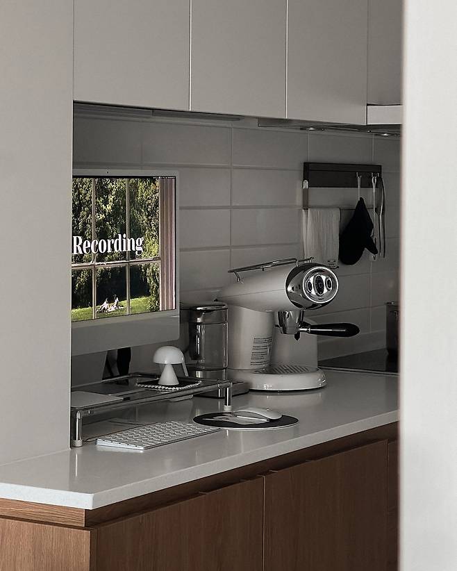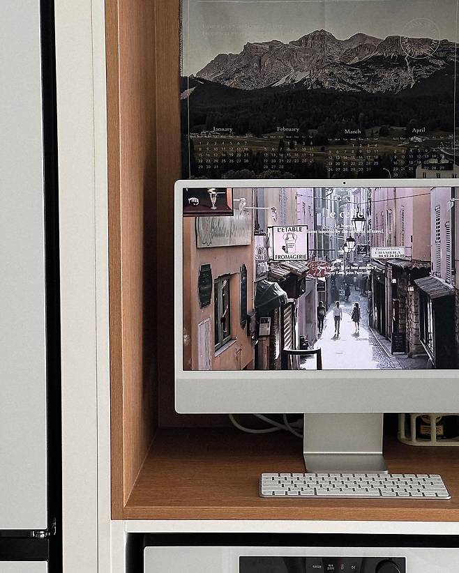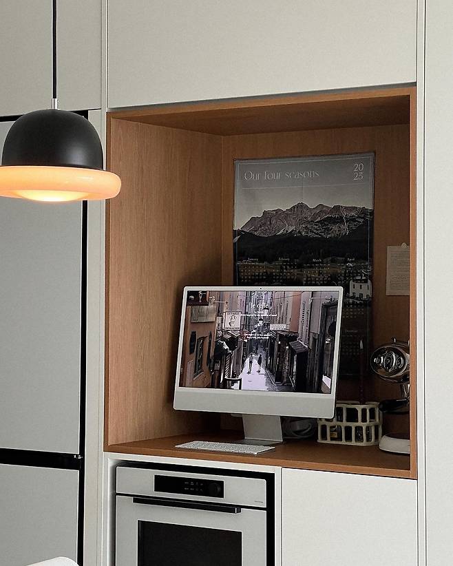 장을 새로 만든 냉장고 홈바 공간이에요. 이곳엔 아이맥과 포스터를 두어 카페의 한 공간처럼 꾸몄어요. 덕분에 아늑하면서도 모던한 분위기가 납니다.
