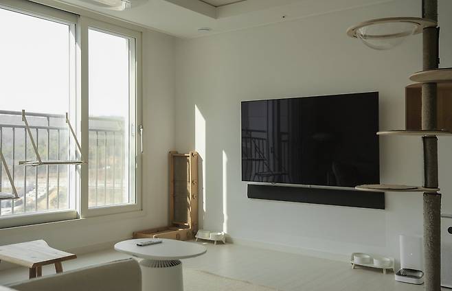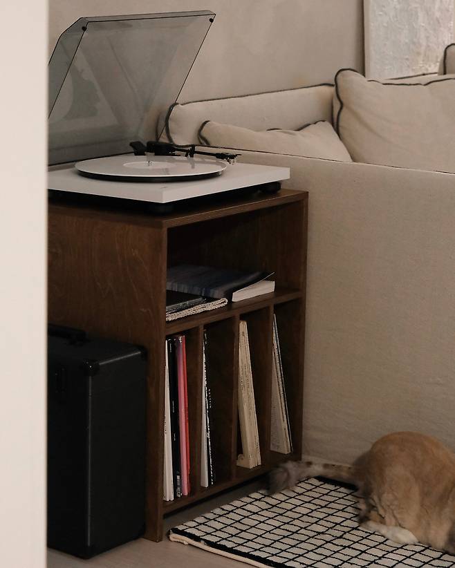 셀프 미장으로 한결 포근해진 거실에서는 주로 퇴근 후 폭신폭신한 소파에 누워 고양이들과 시간을 보내요. 모든 가구가 어두운 우드 톤 혹은 베이지 톤이라 내추럴한 안정감이 있는 공간입니다.