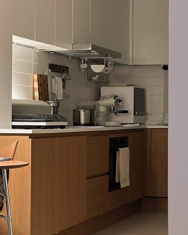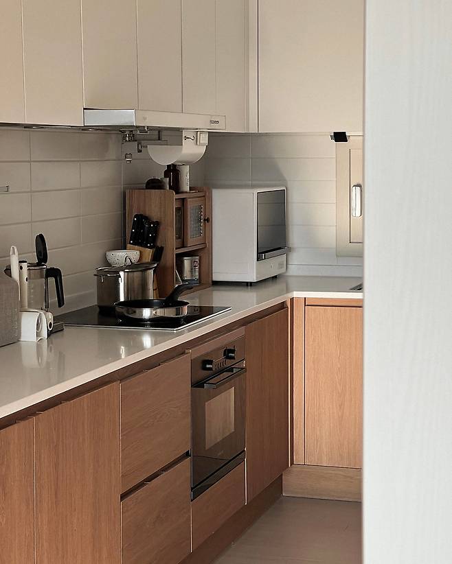 처음에는 주방 하부장 컬러를 전체 화이트로 가고 싶었어요. 하지만 뭔가 평범하기도 하고, 따뜻한 분위기를 원해서 우드로 선택했는데 정말 마음에 듭니다.