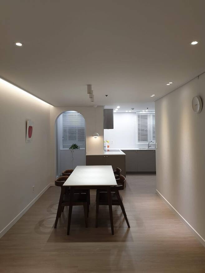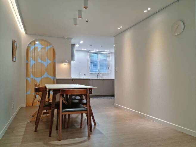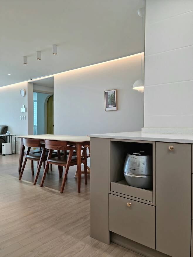 대면형 구조는 하지 못했지만 주방에서 요리할 때 다이닝 공간뿐만 아니라 거실 소파까지 다 보여서 만족하고 있어요.