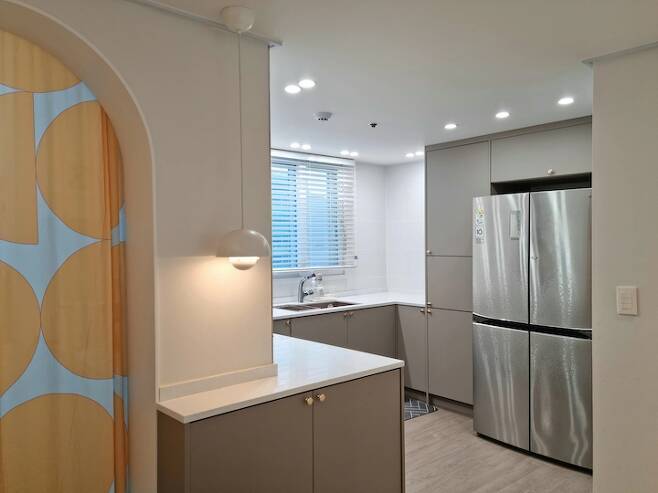 ㄱ자 주방은 ㄷ자 주방으로 변신했어요. 워낙 주방은 좁은 공간이라 냉장고 위치가 참 난감했는데 결국은 안쪽에 자리를 잡았습니다. 신혼 때 구입했던 냉장고는 인테리어 당시에 멀쩡해서 바꾸지 못했어요. 이제 10년 차라 조만간 바꿀 일이 생기려나요?