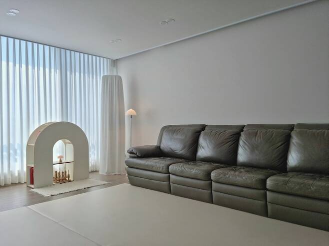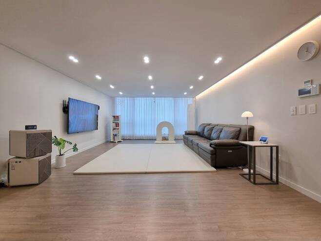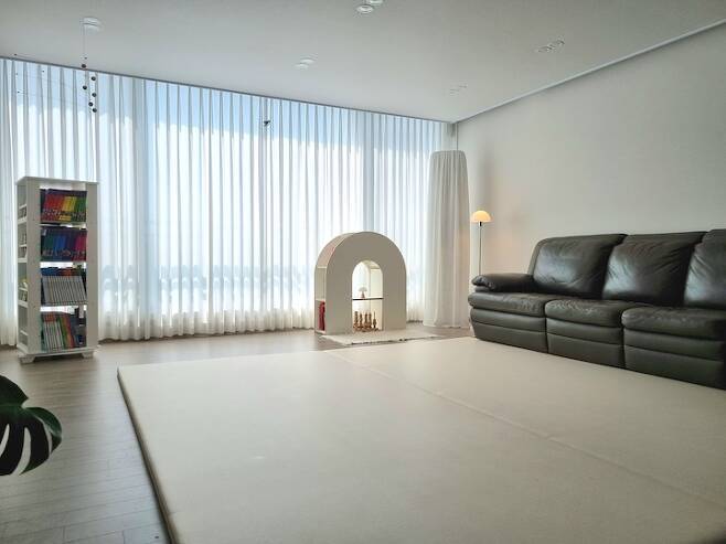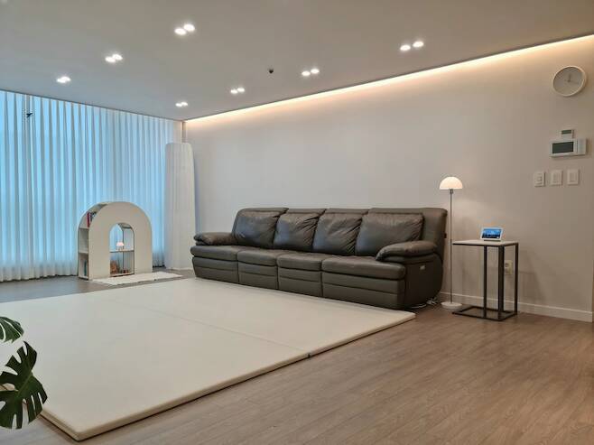 거실은 가장 많은 시간을 보내는 공간인 만큼 최소한의 가전, 가구만 놓고 싶었어요. 이사 당시 첫째 아이만 있어서 러그를 깔고 미니멀리스트로 지냈는데, 둘째 아이가 태어난 후로는 두꺼운 매트를 깔았어요.