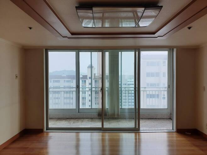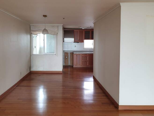 거실은 구축의 전형적인 체리색 몰딩과 바닥 색, 오래된 새시. 모두 철거하기로 했어요. 베란다로 나가는 문이 거실에 있는 것이 싫어서 거실은 벽으로 마감했어요. 베란다는 각각 방에서만 나가는 구조로 변경했습니다.
