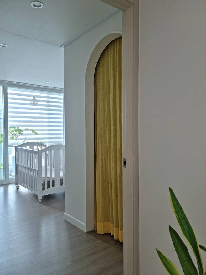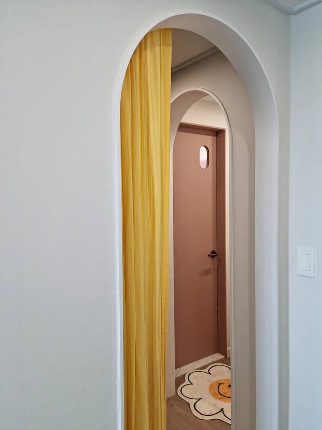 거실에서 안방을 바라보았을 때 커튼을 달아 아치 공간 안은 보이지 않게 했어요. 평소에는 반 정도 열어두고 사용하는 편이고 손님이 오실 때는 커튼으로 가리곤 합니다.