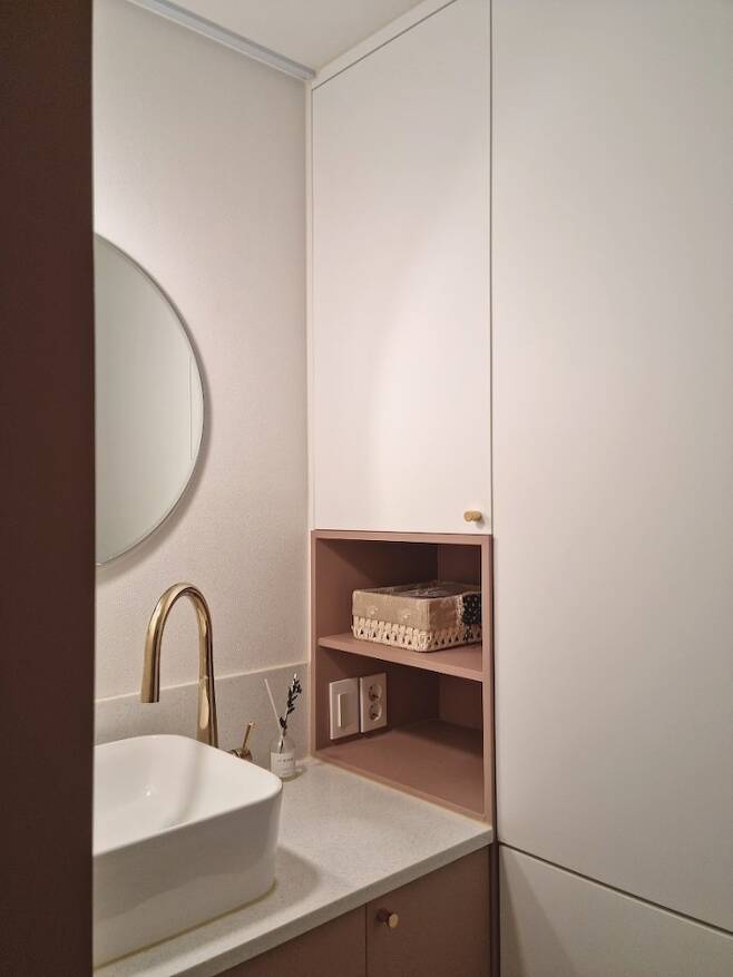 기존에 세탁기를 두던 자리는 확장 후에 수납을 할 수 있는 공간으로 바뀌었어요. 내력벽이 있는 공간도 최대한 철거 한 후에 선반과 수납장을 짜 넣었어요.
