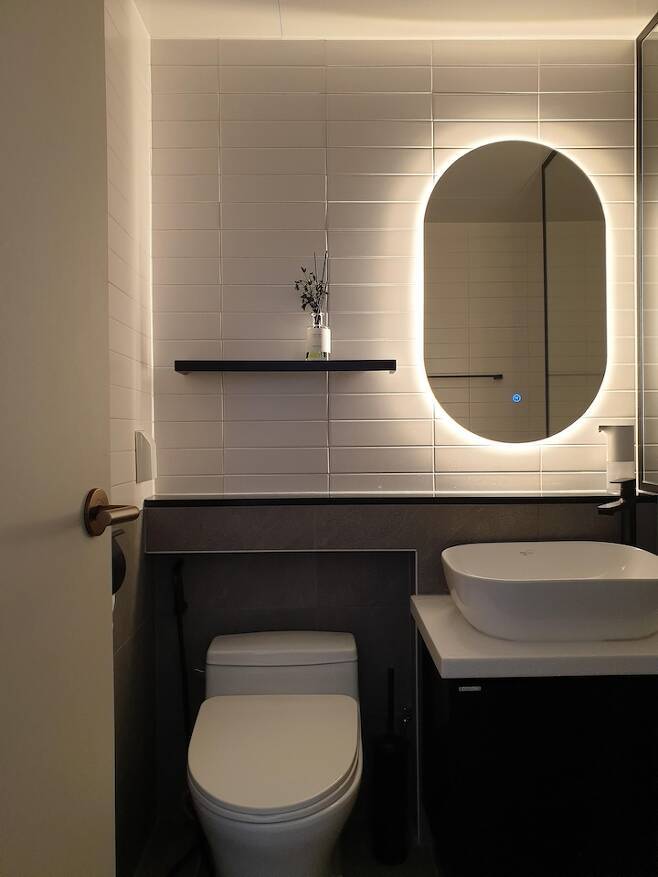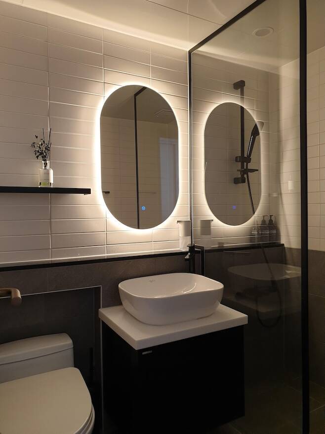 블랙 선반, 블랙 수전 등을 선택했는데 시간이 지나니 관리가 어렵다는 걸 다시 한번 느끼게 되었어요. 얼룩이 쉽게 생기고 코팅이 벗겨지기도 하더라고요. LED 거울은 잘 안 켜게 되는데 첫째 딸은 자주 켜놓고 사용하고 있어요.