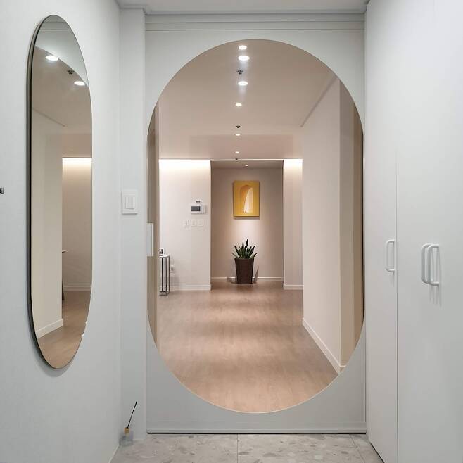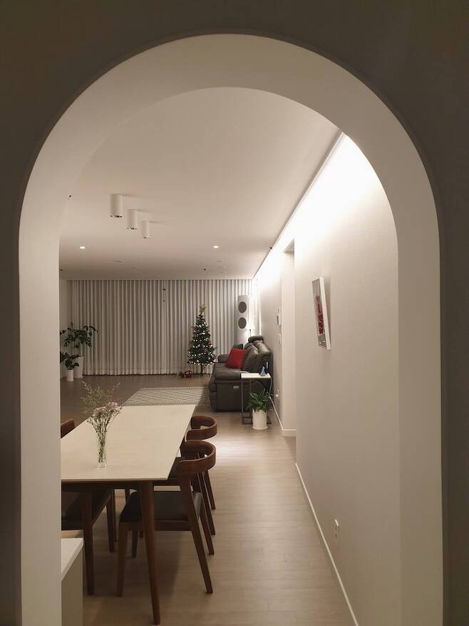 집에 놀러 오시는 분들마다 현관에 들어와서 중문 사이로 보이는 거실을 좋아하시더라고요. 오히려 아치 게이트보다 중문이 예쁘다는 소리를 더 많이 들어보았네요.