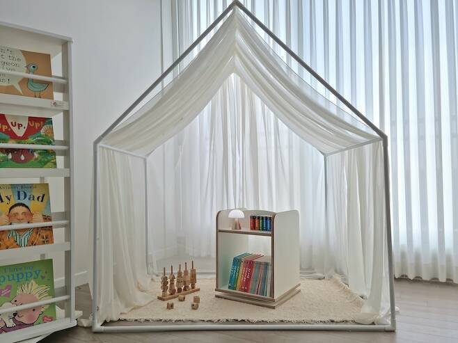 저희 딸들은 거실 한 쪽에 캐노피로 놀이 공간을 만들어주면 참 좋아한답니다. 초등학생 첫째를 키워보니 어릴 때부터 책을 많이 읽는 것만큼 중요한 것이 없더라고요.