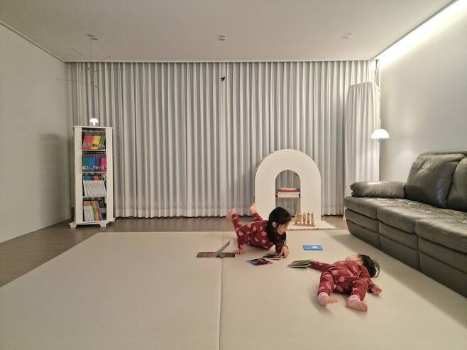 활동적인 둘째는 미끄럼틀을 타는 걸 좋아해서 언니가 쓰던 미끄럼틀을 다시 꺼내주었어요. 때로는 미니멀하게 때로는 아이들의 넓은 놀이공간이 되는 거실이 참 좋아요.