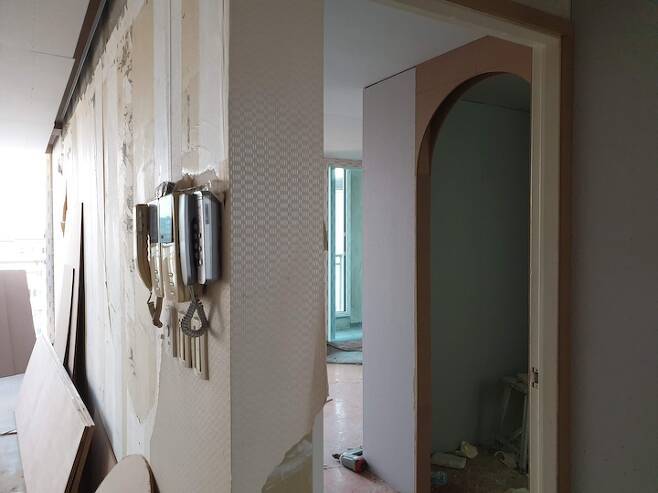 아치게이트를 지나 또 아치게이트를 만나는 공간이네요. 안방 화장실 벽면은 철거가 가능해서 철거 한 후, 최대한 장을 짤 수 있는 공간을 마련했어요.