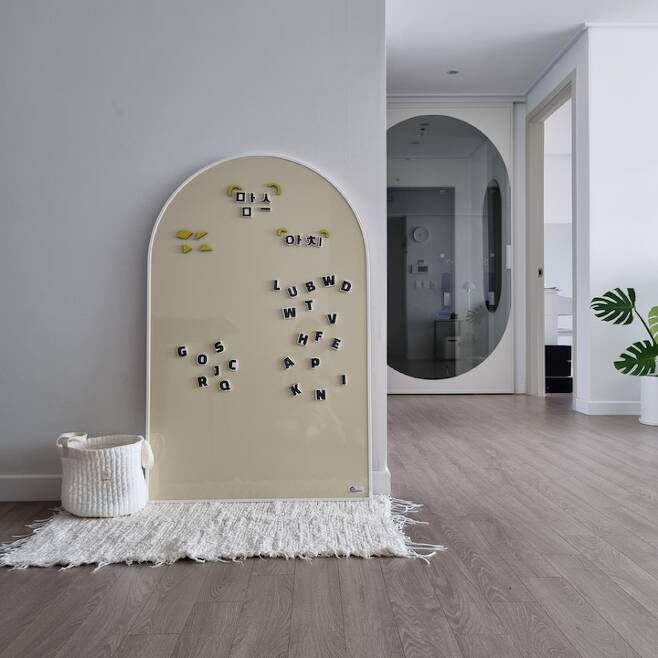 15개월 둘째는 한창 자석 붙이고 떼는 놀이를 좋아해서 다이닝 공간에도 자석 보드를 두었어요. 아치를 좋아해서 소품도 둥근 쉐입 위주로 배치하곤 합니다.
