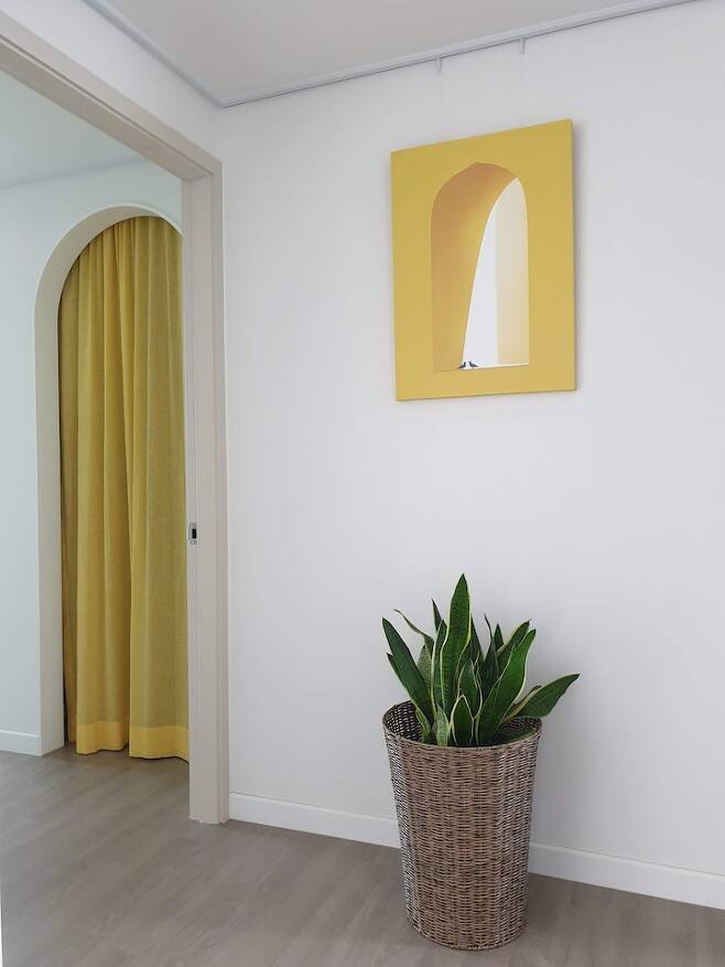 아치 게이트 안쪽에는 커튼 봉을 설치해서 커튼으로 포인트를 주기도 합니다. 노란색을 좋아하는 편은 아닌데 막상 인테리어 소품은 노란색으로 구입하고 있더라고요.