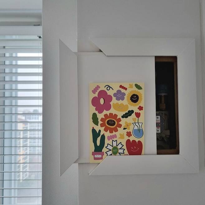 가리고 싶은 분배기는 액자처럼 만들어서 쏙 숨겨 놓았습니다. 엽서 모으는 걸 좋아하는데 모아둔 엽서를 이곳에 하나씩 진열하니 기분 전환도 되고 좋더라고요.
