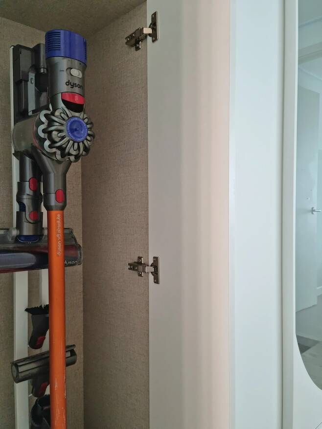 중문 설치를 하면서 빈 공간에 수납장을 짜 넣었어요. 선반에는 수건을 수납하고 아래에는 청소기를 수납할 수 있게 만들었습니다.
