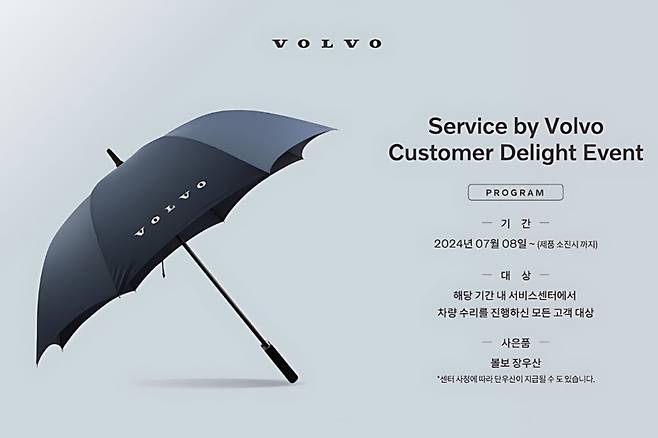 이 캠페인은 오는 7월 8일부터 전국의 39개 볼보자동차 공식 서비스센터에서 시작되며, 차량을 입고하여 수리를 받는 모든 고객에게는 ‘픽 바이 볼보(Pick By Volvo)’ 브랜드 장우산을 선물로 제공한다.