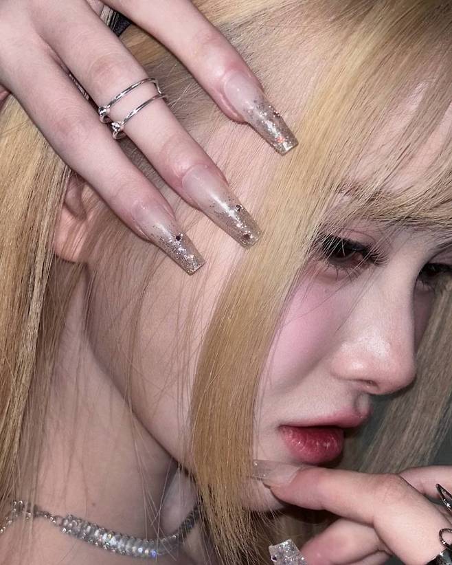 눈길을 끄는 또 다른 포인트는 마유의 네일 스타일링이다. 롱 네일 위에 반짝이는 글리터가 더해져, 손끝에서도 은은한 고급스러움이 느껴진다. 여기에 커다란 실버 플라워 반지를 더해 마치 인형 같은 스타일링을 완성했다. 반지 디자인은 입체적이면서도 독특해, 손 제스처 하나만으로도 시선을 사로잡는다.
