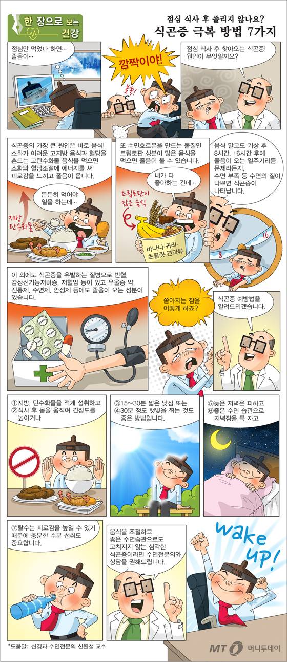 식곤증의 가장 흔한 원인은 '음식'입니다. 특히 소화가 어려운 '고지방 식단'은 소화하기 위해 많은 에너지가 위장관으로 집중되는데, 이에 따라 뇌에 혈액 공급이 줄어 피곤함을 유발합니다. '고탄수화물 식단'은 혈당을 갑자기 높이면서 피로감을 일으키고, 혈당을 낮추기 위해 인슐린이 분비되면서 졸음을 유발합니다. 우유·바나나·귀리·초콜릿·견과류처럼 트립토판이 든 식품도 식곤증을 유발합니다. 트립토판은 수면 호르몬인 멜라토닌의 성분입니다. 식곤증을 극복하는 방법 7가지를 만화에서 찾아보세요.